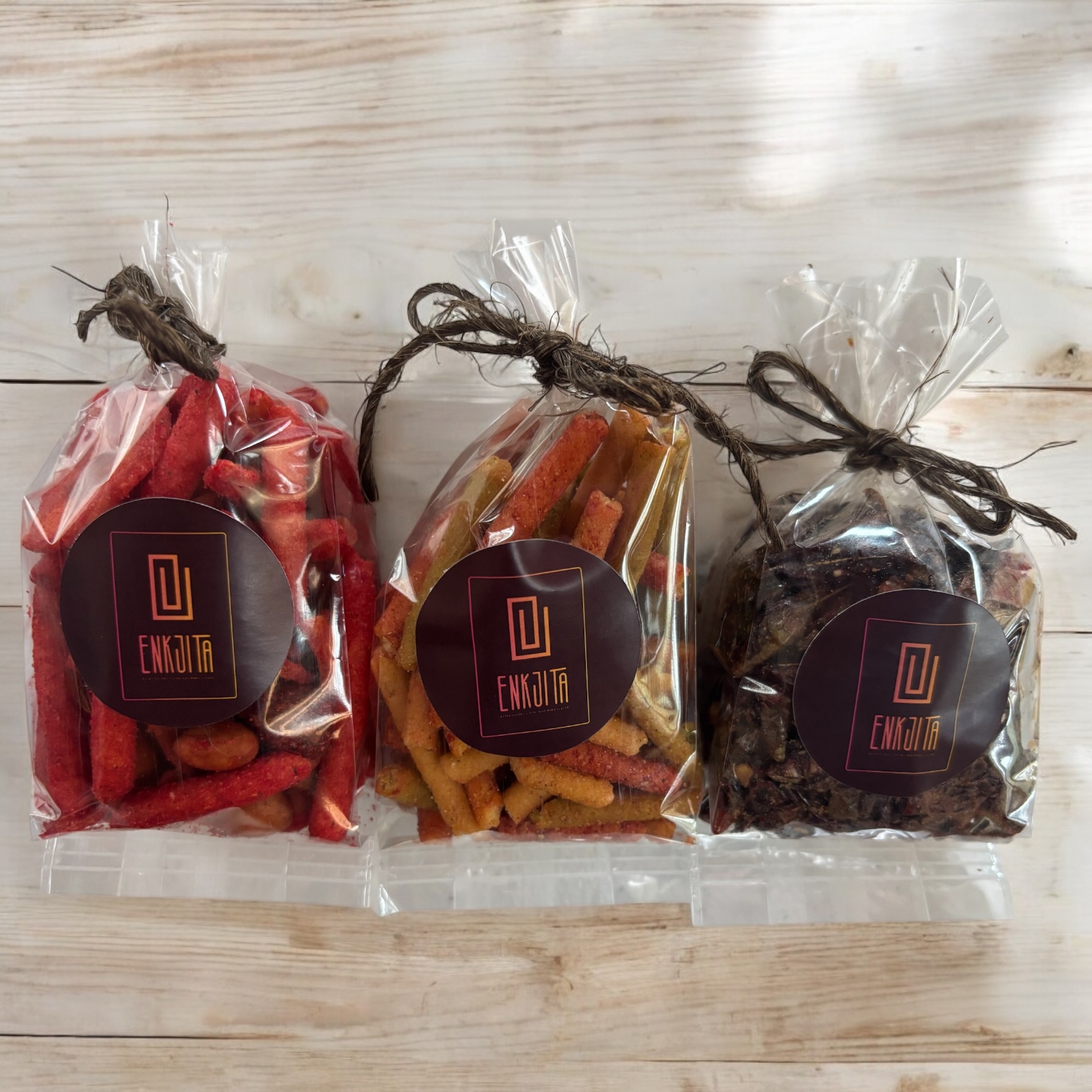 - Botana Chilanga (50 g): Dulces y picantes, deliciosa mezcal de platanitos fritos enchilados, tamarindo y churritos.